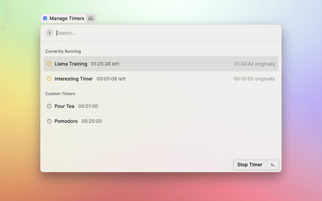 This is a lightweight extension allowing you to start and stop countdown timers, stopwatches, and alarms. It works directly in Raycast, no external apps or dependencies required.