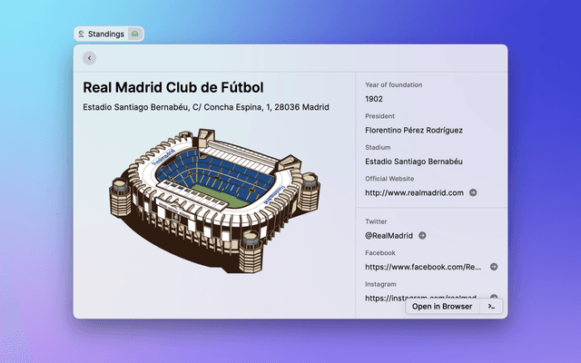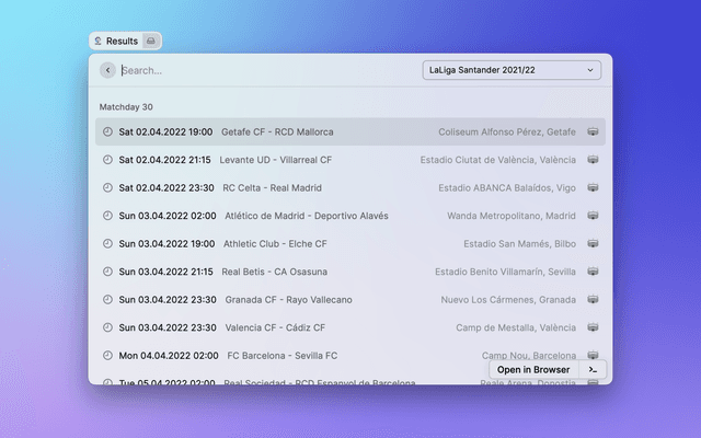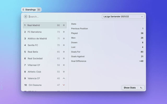All the information of LaLiga Santander, LaLiga SmartBank, and Primera División Femenina: schedules, results, standings, news, statistics, and much more in Raycast