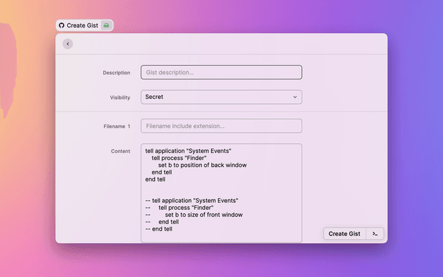 Automatically get the selected text or clipboard and generate a gistfile, you can also add additional gistfiles and finally create a gist. Once created successfully, you can choose to copy the link or open it in your browser.