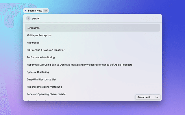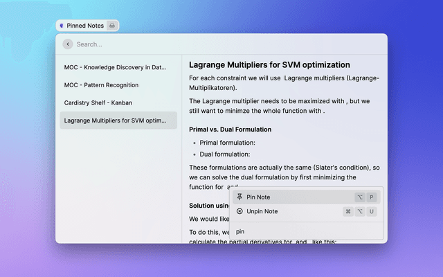 This command will open a list of your pinned notes. All actions and preferences from the Search Note command are available.