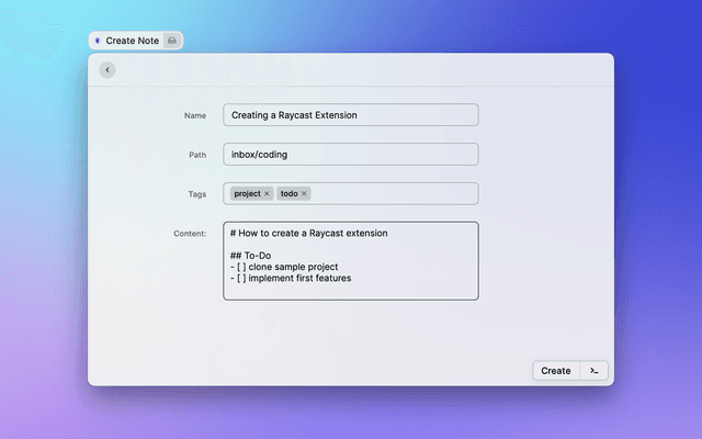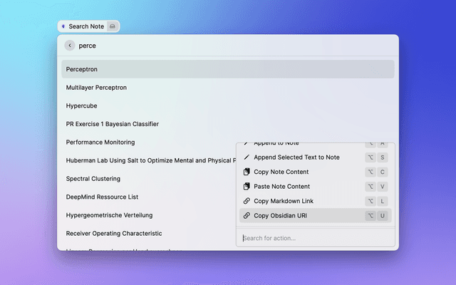 This is a raycast extension with commands for the note taking and knowledge management app Obsidian. To use it, install the extension from the Raycast Store, open Raycast Search and type one of the following commands:
