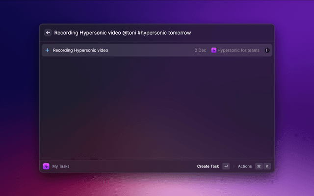 You can manage your tasks faster than ever in Hypersonic. We use natural language recognition to separate the task from its metadata, so you just need to type.